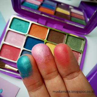 Sekarang kita bahas warnanya ya. Jadi dalam satu palette itu terdiri dari 12 shade. Sepertinya namanya "rainbow", jadi eye shadow ini memang warnanya banyak. Macem-macem warna ada. Untuk yang suka main warna dan berani sih ini cocok. Tapi kalau yang lebih suka warna-warna aman atau nude, aku rasa sih ini kurang cocok untuk kalian.